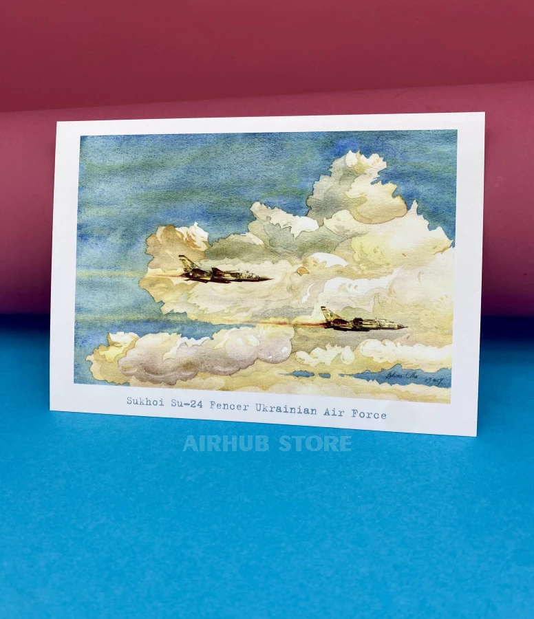 Watercolor postcards Ukrainian Air Force in flight (Su-24 Fencer , Cardboard)