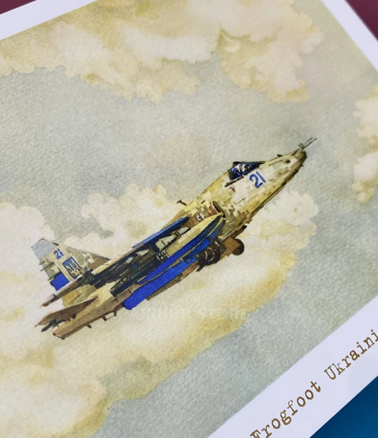 These postcards are based on real watercolor paintings dedicated to combat aviation and the Ukrainian Air Force. The illustrations depict legendary aircraft—the Su-24 front-line bomber and the Su-25 attack aircraft—flying among the clouds and light of the sky. The watercolor technique gives the works softness, depth, and a sense of space. The smooth color transitions, transparency of the paints, and dynamic composition create the effect of a living sky and movement in the air.