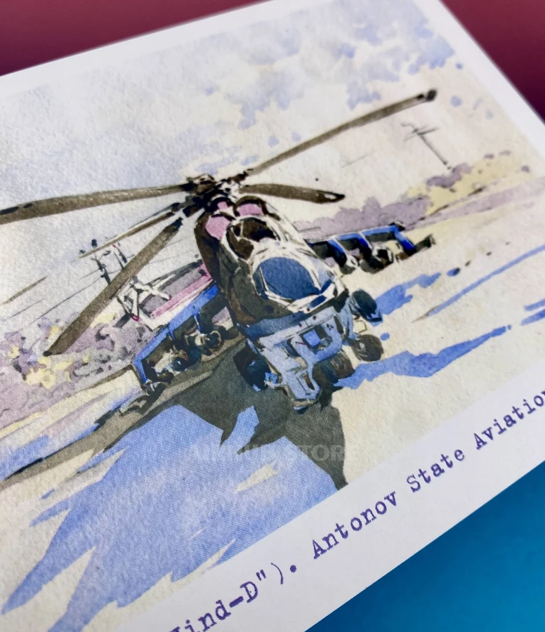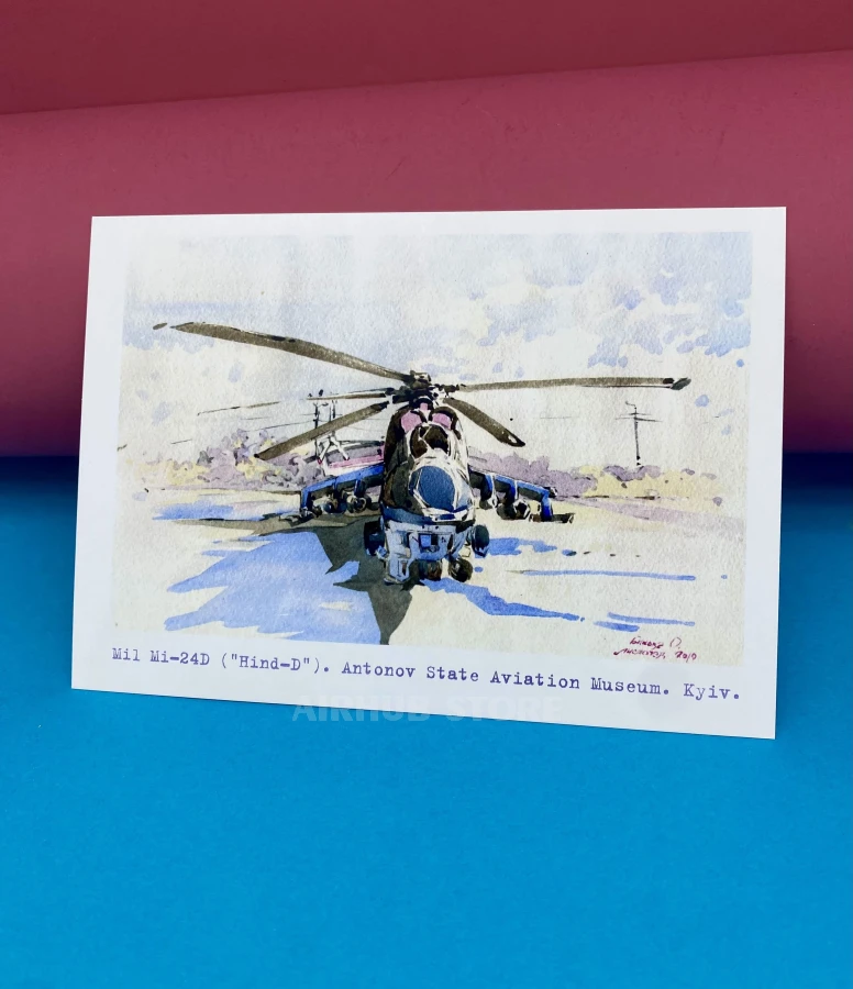 Watercolor postcards with airplanes Aviation Museum (MI-24 HIND , Cardboard)