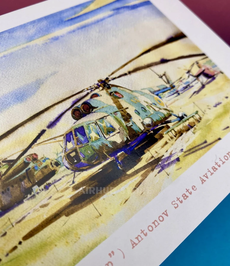 Printed postcards with artistic images of airplanes and helicopters, created based on watercolor illustrations in aviation style.