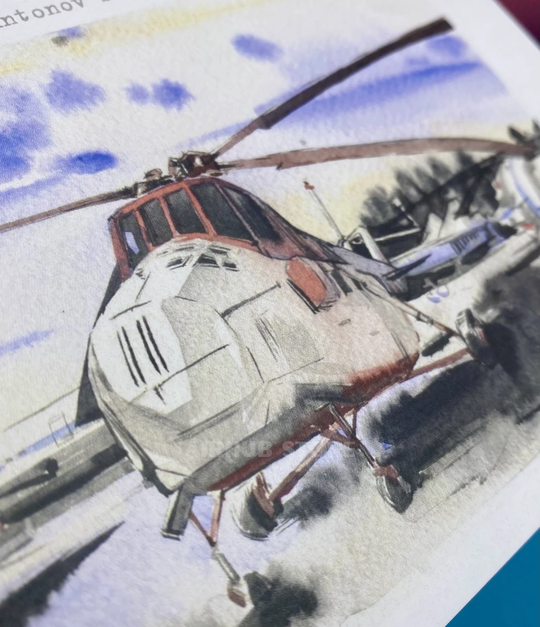 Printed postcards with artistic images of airplanes and helicopters, created based on watercolor illustrations in aviation style.