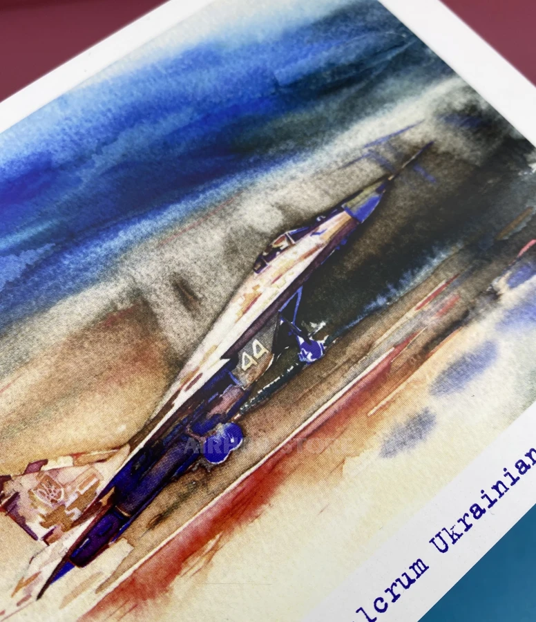 This postcard is based on a real original drawing, made with watercolors on paper. The image is based on a live artwork, where every stroke, color transition, and light and shadow convey the atmosphere of the sky, the speed, and the character of combat vehicles. The theme of the illustrations is centered around the Ukrainian Air Force and Ukrainian military aviation.