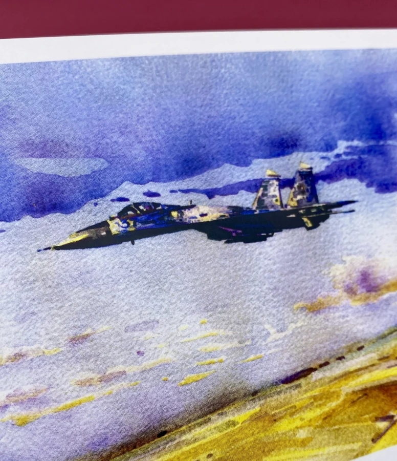 This postcard is based on a real original drawing, made with watercolors on paper. The image is based on a live artwork, where every stroke, color transition, and light and shadow convey the atmosphere of the sky, the speed, and the character of combat vehicles. The theme of the illustrations is centered around the Ukrainian Air Force and Ukrainian military aviation.