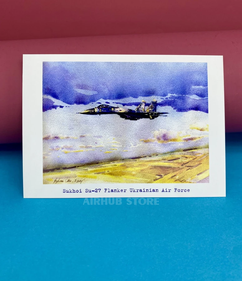 The print preserves the character of the artwork, so the postcard looks like a miniature reproduction of the original watercolor. It is suitable for sending, storing in a collection, or framing as a small aviation art object related to the theme of the Ukrainian Air Force.