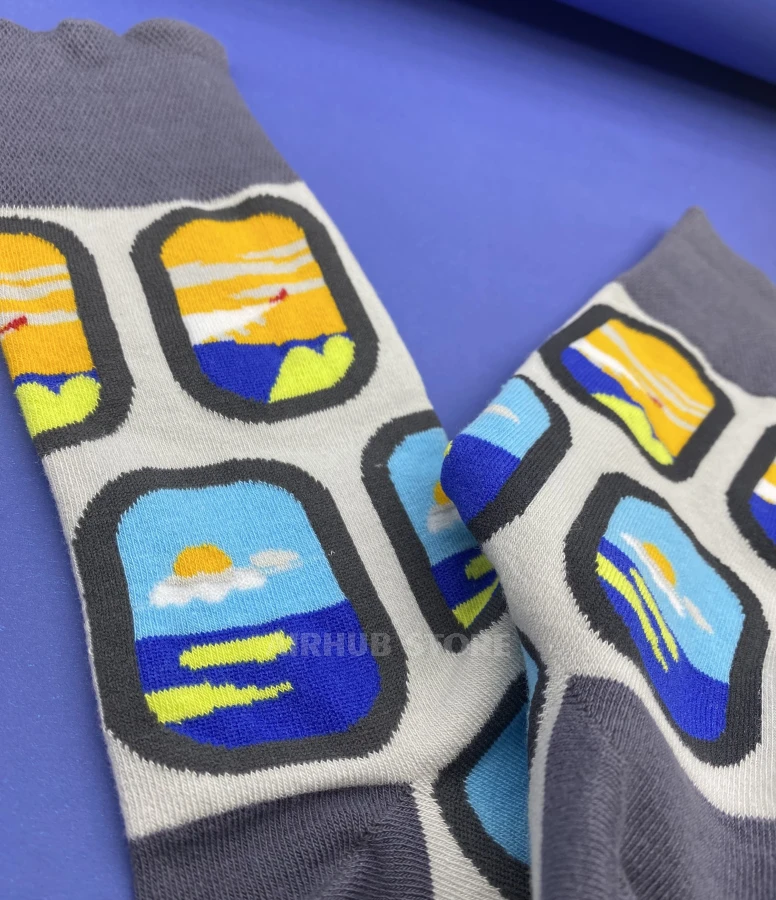 These aviation socks are designed for those who cannot imagine life without the sky. Their design reproduces a series of airplane windows, each offering a new landscape: sunset, blue sea, bright daylight, or distant clouds. Just like during a flight, when every glance out the window tells a different story.