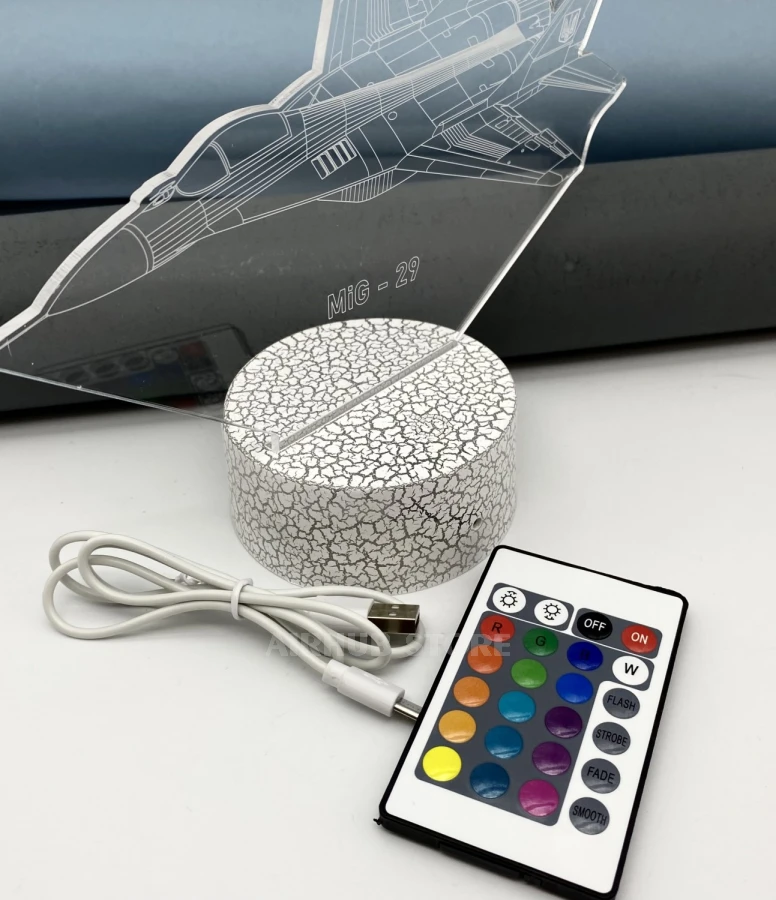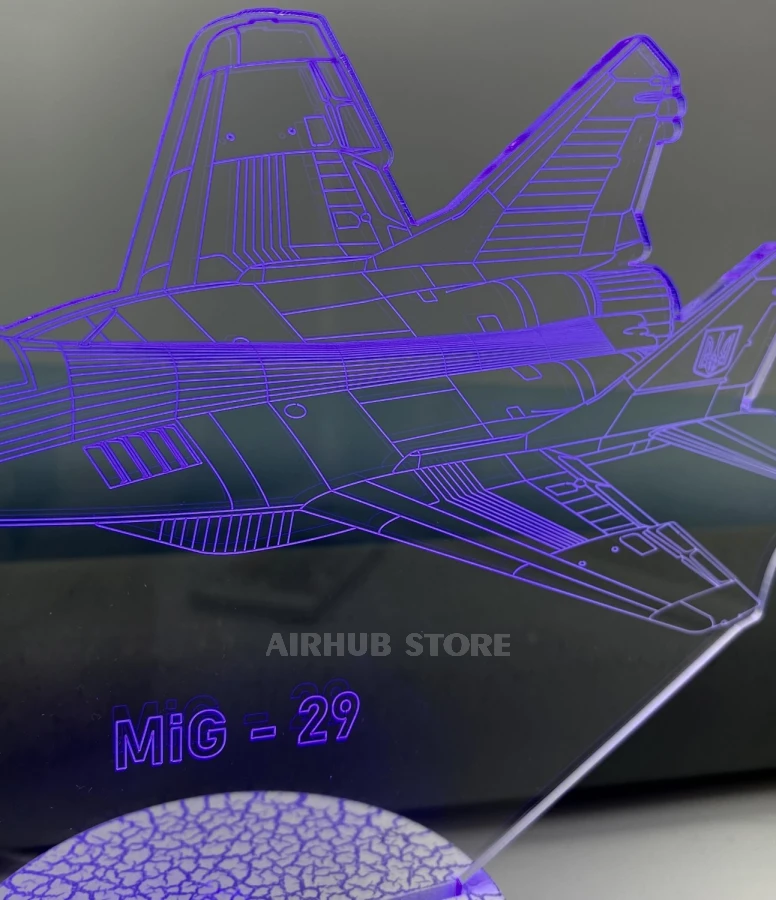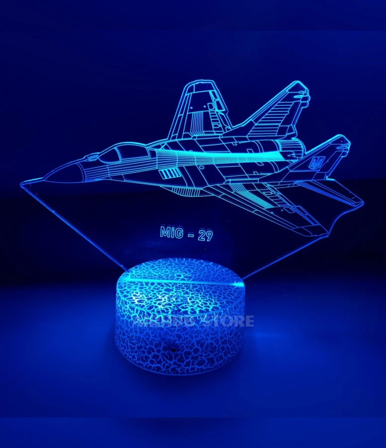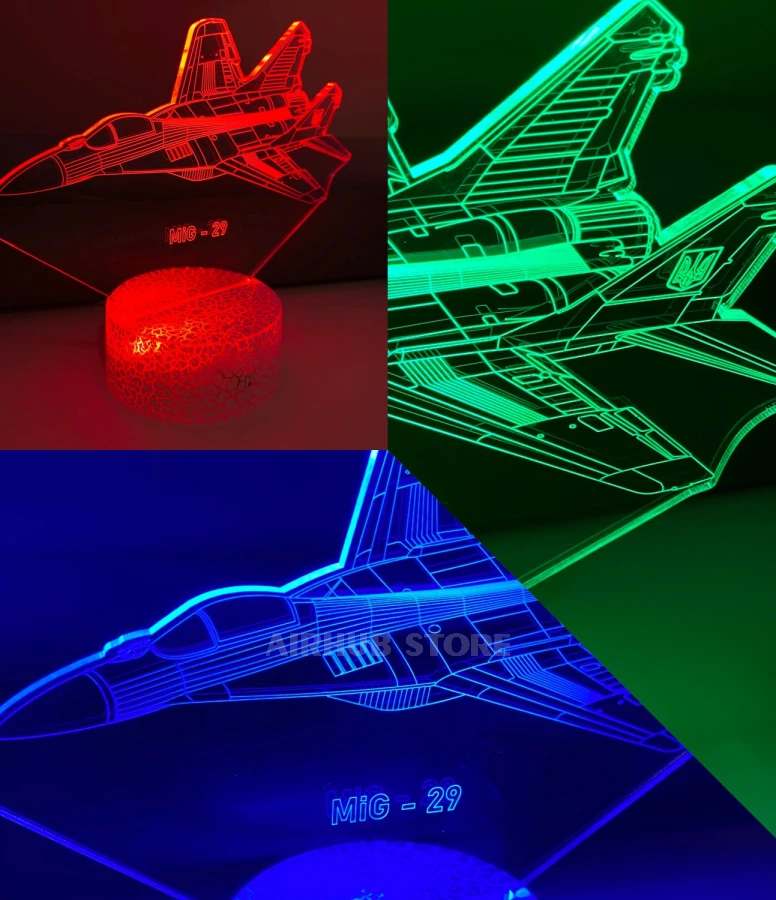 МиГ-29 - многоцелевой истребитель четвертого поколения. Сейчас находится на вооружении многих стран мира, в том числе и Украины. Заказывайте ночник МиГ-29 с 3D эффектом и дистанционным управлением света прямо сейчас и создайте уникальную атмосферу в вашем помещении!