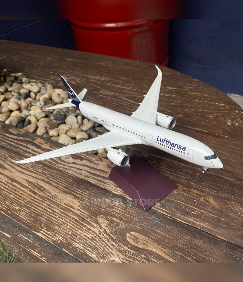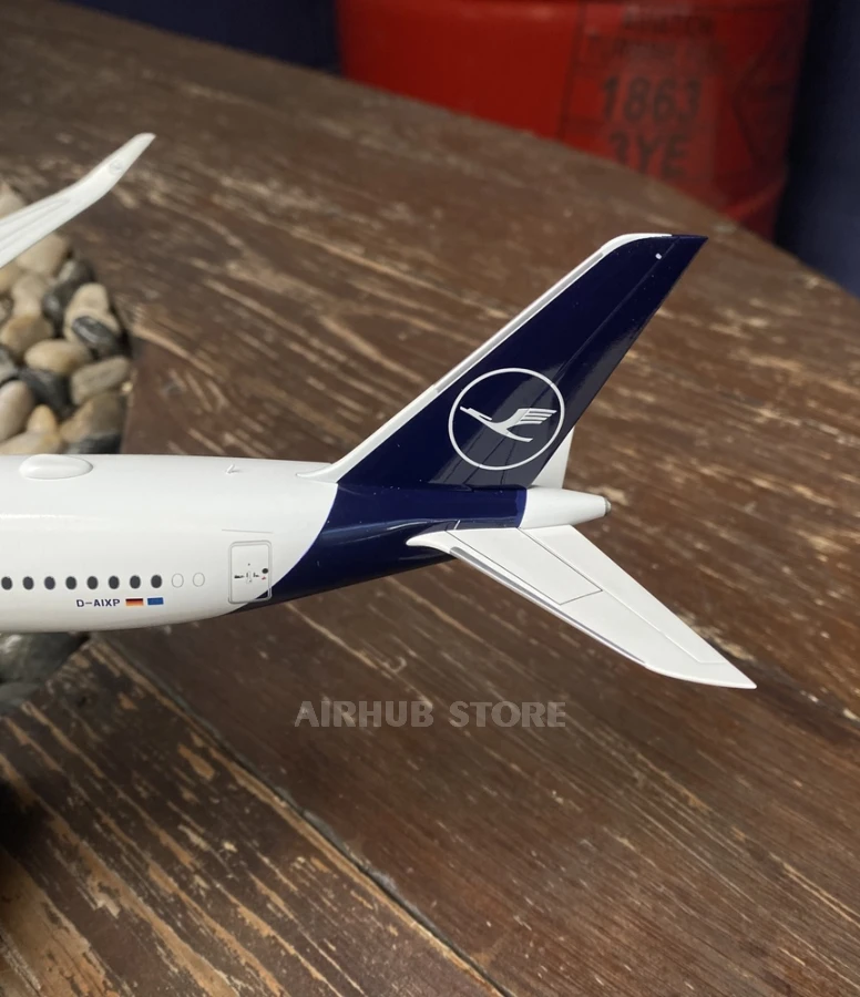 Модель поражает детализацией: от фирменной ливреи Lufthansa до точной проработки двигателей Rolls-Royce Trent XWB, крыльев с характерным изгибом и реалистичной конструкции вращающихся шасси. Прочный металлический корпус гарантирует долговечность, а стильная подставка позволяет эффектно презентовать модель на полке или в витрине.