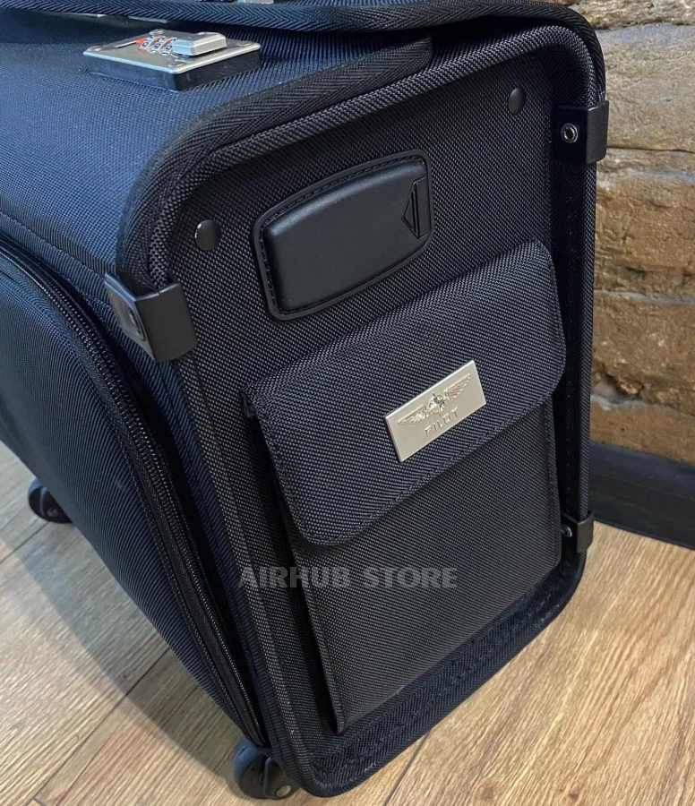 Есть два внешних боковых кармана, которые можно использовать для хранения, а также держатели для ручек и съемный держатель для ключей. Над левым карманом есть табличка с именем, чтобы можно было идентифицировать пилотную сумку и вернуть ее владельцу в случае потери.