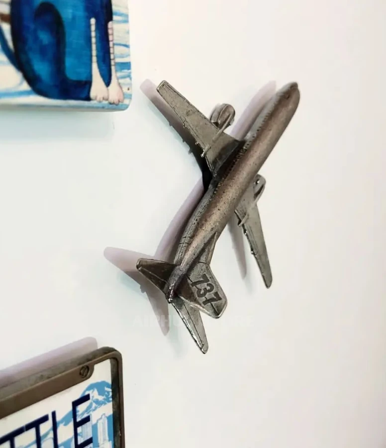Магніт відтворює культовий Boeing 737 у мініатюрі, з чітким рельєфом корпусу та характерною формою крил. Він виготовлений із олова з легким блиском.