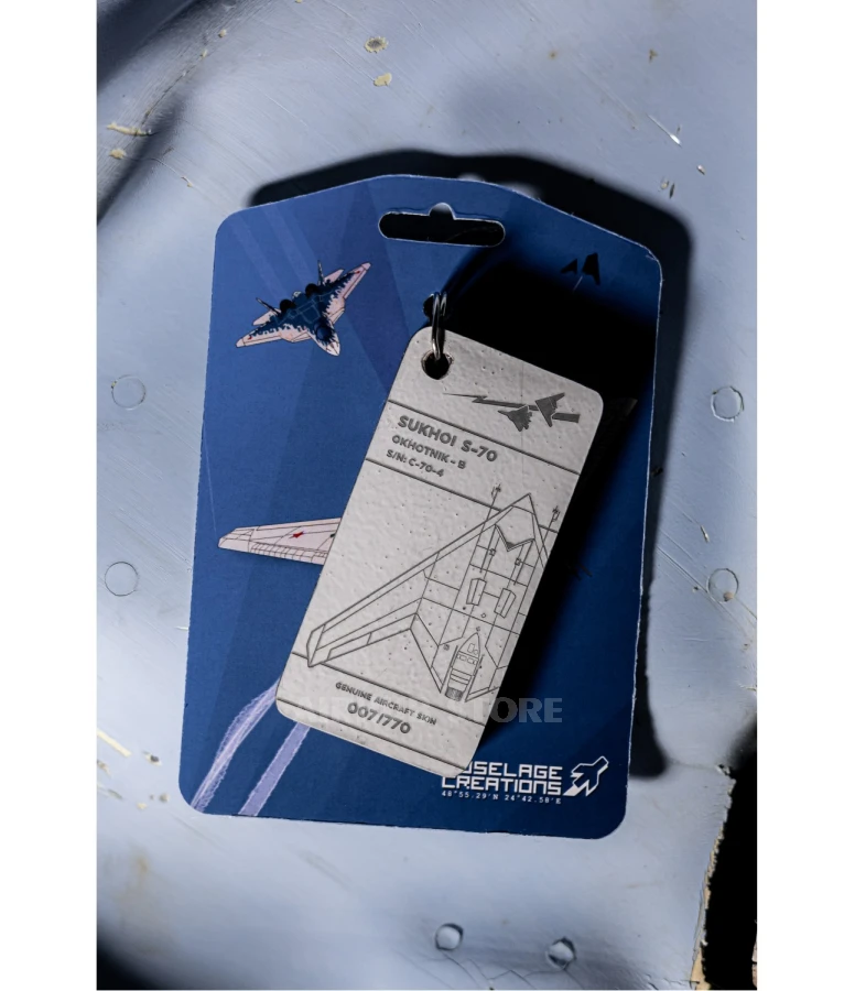 Брелок з справжньої обшивки Сухой С-70 Охотник-Б (Охотник-Б) - важкий малопомітний безпілотний бойовий літальний апарат (БПЛА). Розробка S-70 була розпочата ще в 2011 році компанією Сухой, а пізніше - авіабудівною корпорацією МіГ. Так званий російський «інноваційний» прототип, очевидно, є «запозиченою» версією програм Boeing X-45 і Northrop Grumman X-47B ще з початку 2000-х років.
