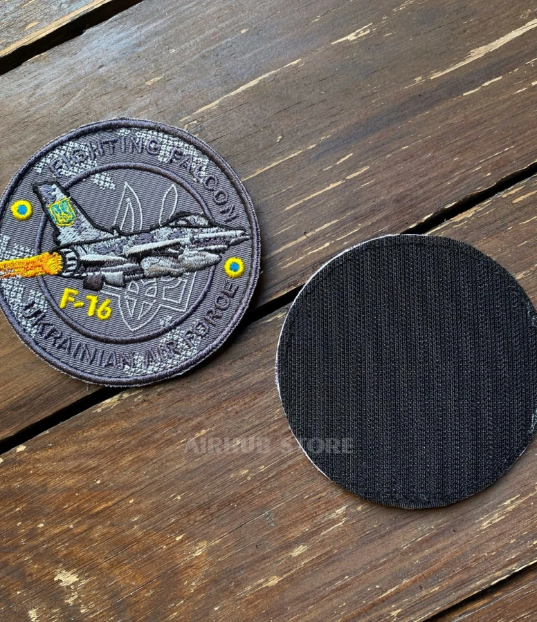 На нашивці вишитий французький винищувач із синьо-жовтими розпізнавальними знаками та бойовим озброєнням, а по колу нанесено напис Ukrainian Air Force. Такий дизайн поєднує сучасну авіацію з українським контекстом, підкреслюючи підтримку повітряного флоту в умовах війни.